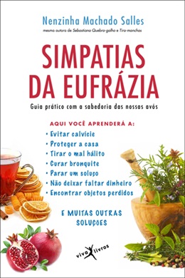Produto sob Encomenda Simpatias da Eufrázia Nenzinha Machado Salles Quem já não ouviu falar de simpatia? Neste livro vocês conhecerão uma infinidade delas, muitas usadas desde a época de nossas bisavós. São simpatias para curar ressaca, evitar calvície, tirar mau hálito, para um soluço, curar gagueira, guardar a casa, não deixar faltar dinheiro, encontrar objetos perdidos e muitos outros problemas que perturbam a todos nós. Só não há simpatias para arranjar namorado, porque essas pertencem ao folclore das noites juninas.