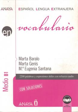 Vocabulario Medio B1ANAYA ELE EN es una colección temática diseñada para aunar teoría y práctica en distintos ámbitos de la enseñanza de ELE. Pone al alcance del estudiante de español como lengua extranjera un material de trabajo que le sirve de complemento a cualquier método. Este Vocabulario se inicia con la representación gráfica de un tema y continúa con una serie de ejercicios variados. Se presta especial atención a la comprensión auditiva del léxico a través de grabaciones orales de los textos y actividades específicas.ESTRUCTURA de la UNIDADCada Unidad consta de:¡FIJESE! Viñeta que ilustra una selección de palabras del tema que se estudia.FRASES ÚTILES Se presenta el vocabulario en una serie de enunciados que contienen parte de los términos ilustrados.PALABRAS EN CONTEXTO Actividad que trabaja, a partir de un texto, palabras del campo semántico de la unidad.EJERCICIOS Serie de actividades variadas.OTRAS PARTES DEL LIBRO- Contiene 2 CD audio- Test de Autoevaluación- Soluciones- Glosario alfabético. Listado de los términos estudiados, seguidos de líneas de puntos, con el fin de que el alumno lo traduzca a su idioma.- Glosario temático. Siguiendo la estructura del Plan Curricular del Instituto Cervantes, se ofrece un índice de materias que recoge los términos clasificados por temas, indicando, además, la unidad donde se trabajan.