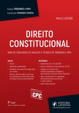 Atualizado até a EC 932016.Ampla coletânea jurisprudencial do STF.Capítulo de controle de constitucionalidade ampliado e aprofundado, incluindo Temas Especiais.Texto constitucional e legislação infraconstitucional pertinente a cada capítulo.Edital sistematizado. O objetivo da coleção é a preparação direcionada para os concursos de Técnico e Analista do TRT, TRE, TRF, MPU e Tribunais Superiores. Em todos os livros o candidato irá encontrar teoria específica prevista nos editais, questões recentes comentadas e questões de concurso com gabarito fundamentado. A ideia da coleção surgiu em virtude das reivindicações dos estudantes, que almejavam por obras direcionadas para os concursos de Técnico e Analista dos Tribunais.As apostilas específicas mostram-se, na maioria das vezes, insuficientes para o preparo adequado dos candidatos diante do alto grau de exigência das atuais provas, o que ocorre também com as obras clássicas do direito, por abordarem inúmeras matérias diferentes ao concurso.Nessa coleção o candidato encontrará desde as cinco matérias básicas exigidas em todos os concursos, como, português, raciocínio lógico ou matemática, informática, direito constitucional e administrativo, até as matérias específicas de outras áre