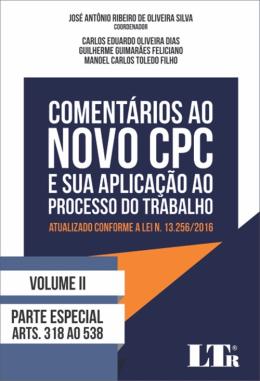 Produto sob Encomenda Esta obra representa o segundo volume de uma série cujo objetivo é comentar integralmente o novo CPC, desde a ótica particular do processo do trabalho. Seus quatro autores são magistrados trabalhistas e docentes-doutores. Ao tempo em que analisamcom profundidade as inovações trazidas pelo novo CPC, na perspectiva da Teoria Geral do Processo, os autores examinam, artigo por artigo, a compatibilidade das normas do novo Código de Processo Civil com as normas do processo do trabalho, para verificar a possibilidade de aplicação subsidiária ou supletiva daquelas ao processo trabalhista. Trata-se, portanto, de obra indispensável aos atores que militam de fato na Justiça do Trabalho – juízes, procuradores do trabalho, advogados, servidores e outros –, pois lhes proporciona consistentes argumentos para que resistam às tentações dos comentários fáceis, com gosto pelo novidadismo, e mantenham firmes as raízes que fizeram do processo do trabalho um paradigma de eficiência.