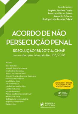 CONFORME Resolução 181/2017 do CNMP, com as alterações feitas pela Res. 183/2018 BÔNUS Anexos com modelos de acordos de não persecução penal POR QUE ESCOLHER O LIVRO ACORDO DE NÃO PERSECUÇÃO PENAL? Com muito orgulho, o nosso livro Acordo de Não Persecução Penal chega à sua 3.a edição, o que demonstra uma honrosa acolhida pelo público e também denota a importância que, cada vez mais, e desde a sua 1.a edição (lançada logo depois da publicação da Resolução n. 181/17-CNMP), o tema vem alcançando. Nesta nova edição, contamos com a atualização e ampliação de vários de seus textos, tais como o artigo "Um panorama do acordo de não persecução penal", de Rodrigo Leite Ferreira Cabral; "O acordo de não-persecução penal: reflexão a partir da inafastabilidade da tutela jurisdicional", de Antonio Henrique Graciano Suxberger; "A legalidade do acordo de não persecução penal (Res. 181/17 CNMP): uma opção legítima de política criminal", de Rogério Sanches Cunha e Renee do Ó Souza; "Algumas respostas sobre o acordo de não persecução penal", de Renee do Ó Souza e Patrícia Eleutério Campos Dower; e "Acordo de Não Persecução Penal: Permissões e Vedações", de Americo Bedê Freire Junior. Antes de encerrar, gostaríamos de realçar também a importância que tem recebido o instituto do acordo de não persecução na jurisprudência, existindo já uma série de julgados a ele favoráveis, bem como a acolhida do seu teor em dois importantes Projetos de Lei, um apresentado pela Comissão forma