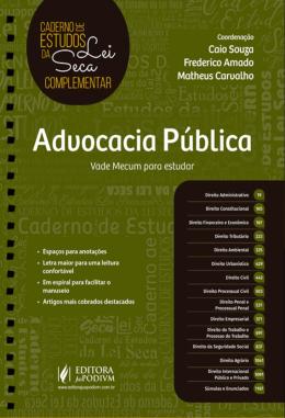 omplete seus estudos com a seleção de normas específicas para a carreira de sua escolha! IDEAL PARA OS CONCURSOS PÚBLICOS DE INGRESSO NA CARREIRA DE: - Advogado da União (AGU) - Procurador da Fazenda Nacional (PGFN) - Procurador Federal (PGF) - Procurador do Estado (PGE) - Procurador do Município (PGM) POR QUE ESCOLHER O CADERNO DE ESTUDOS DA LEI SECA COMPLEMENTAR? - Desenhado para o estudo da Lei Seca - Direcionado para sua carreira - Seleção elaborada por especialistas - Artigos mais cobrados destacados - Com espiral para facilitar o manuseio - Tarjas laterais facilitadoras de pesquisa - Espaços maiores para anotações - Letra maior para uma leitura confortável - Atualização periódica gratuita da legislação pelo site da Editora até 31/07/2020 CONHEÇA A ESTRUTURA DO CADERNO DE ESTUDOS DE LEI SECA COMPLEMENTAR: - Direito Administrativo - Direito Constitucional - Direito Financeiro e Econômico - Direito Tributário - Direito Ambiental - Direito Urbanístico - Direito Civil - Direito Processual Civil - Direito Penal E Processual Penal - Direito Empresarial - Direito do Trabalho e Processo do Trabalho - Direito da Seguridade Social - Direito Agrário - Direito Internacional Público e Privado - Súmulas e Enunciados *As leis indicadas por um asterisco no sumário são apresentadas parcialmente, com a seleção dos artigos que são mais cobrados em cada carreira (direcionamento do estudo) O LEITOR ENCONTRARÁ: Decreto-Lei nº 200/1967 - Org