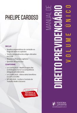 LEITOR ENCONTRARÁ: - Quadros esquemáticos de conteúdo ao longo de todos os capítulos - Tabela comparativa dos artigos alterados na CF/88 - Resumo ao final dos capítulos - Questões de concursos CONFORME: - Reforma da Previdência - EC 103/2019 - Lei 13.876/2019 – Modifica regras das contribuições na CLT e a competência delegada previdenciária - Lei 13.846/2019 – Altera vários benefícios na Lei 8.213/1991 - MP 905/2019 – Institui o Contrato de Trabalho Verde e Amarelo AUTOR: Phelipe Cardoso Juiz Federal no estado de São Paulo e professor de Direito Previdenciário do Curso Ênfase. POR QUE ESCOLHER O LIVRO MANUAL VOLUME ÚNICO DE DIREITO PREVIDENCIÁRIO? Esta obra objetiva fazer uma exposição sistemática do Direito Previdenciário – além de pontuar determinados aspectos dos demais ramos da Seguridade Social –, passando pelo Regime Geral de Previdência Social, pelo Regime Próprio de Previdência dos Servidores (normas gerais e normas federais) e pela Previdência complementar. O texto busca o máximo de didática, sem perder o rigor técnico da exposição e a atenção quanto a detalhes da redação dos dispositivos legais. Como reforço didático, a explanação é acompanhada de inúmeras tabelas para decomposição de conceitos e classificações, comparações e cotejos interpretativos, sendo frequentemente apresentados exemplos simulados. Ao final de cada capítulo há um resumo da matéria abordada e questões de concurso para treinar e facilitar a fixação. A obra est