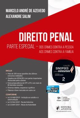 raz diversas correntes doutrinárias e jurisprudência atualizada. Cliente: Jonathan Exequiel Abendroth - 01/03/2019. Doutrina otimizada para concursos. O LEITOR ENCONTRARÁ: - Conteúdo sobre a Parte Especial - Dos crimes contra a pessoa aos crimes contra a família - Mais de 100 novas questões dos últimos concursos realizados no decorrer do texto - Quadros de ATENÇÃO com partes importantes destacadas pelos autores - Farta jurisprudência do STF e STJ, com mais de 80 decisões recentes - Quadros, tabelas comparativas, esquemas e desenhos - Palavras-chave marcadas em outra cor CONFORME: - Lei 13.968/2019 - Incitação ao suicídio e à automutilação - Lei 13.964/2019 - Pacote Anticrime - Lei 13.869/2019 - Abuso de Autoridade CONHEÇA A COLEÇÃO: A Coleção Sinopses para Concursos tem por finalidade a preparação para concursos públicos de modo prático, sistematizado e objetivo.Foram separadas as principais matérias constantes nos editais e chamados professores especializados em preparação de concursos a fim de elaborarem, de forma didática, o material necessário para a aprovação em concursos. Diferentemente de outras sinopses/resumos, preocupamos em apresentar ao leitor o entendimento do STF e do STJ sobre os principais pontos, além de abordar temas tratados em manuais e livros mais densos. Assim, ao mesmo tempo em que o leitor encontrará um livro sistematizado e objetivo, também terá acesso a temas atuais e entendimentos jurisprudenciais. Dentro da metodolo