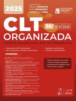 Produto sob Encomenda A CLT Organizada, em sua 13ª edição, sob a coordenação dos professores Vólia Bomfim, Iuri Pinheiro e Fabrício Lima, oferece diversos facilitadores de usabilidade, consulta e manuseio para acompanhá-lo na sua rotina de estudos, provas e prática profissional. MUITAS VANTAGENS PARA VOCÊ! > Seleção e organização de normas trabalhistas > Notas remissivas a artigos, diplomas legais e súmulas > Índice cronológico geral com todos os diplomas legais da obra > A melhor experiência de consulta: Índice Alfabético-Remissivo Unificado > Material suplementar on-line: + normas e tabelas comparativas NOVO PROJETO GRÁFICO PRÁTICO E MODERNO para oferecer: > Mais remissões no texto da CLT: notas com transcrição de artigos e súmulas relacionadas > Facilitadores para busca e localização das normas: • Artigos e leis nos cabeçalhos em destaque • Tarjas identificadoras das seções da obra • As mais recentes atualizações legislativas destacadas em boxes A CLT Organizada da Editora Método é ideal para estudo e consulta em provas da OAB, graduação, concursos públicos e no seu dia a dia como profissional da área.