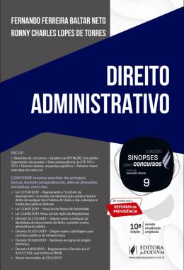 onteúdo conforme a Reforma da Previdência O LEITOR ENCONTRARÁ: - Doutrina otimizada para concursos - Questões de concursos - Quadros de ATENÇÃO com partes importantes destacadas - Farta jurisprudência do STF, STJ e TCU -Diversas tabelas, esquemas e gráficos - Palavras-chave marcadas em outra cor CONTÉM: *Recentes questões das principais bancas, decisões jurisprudenciais, além de alterações normativas CONFORME: - Lei 13.934/2019 – Regulamenta o “contrato de desempenho”, no âmbito da administração pública federal direta de qualquer dos Poderes da União e das autarquias e fundações públicas federais. - Lei 13.869/2019 – Nova Lei de Abuso de Autoridade - Lei 13.848/2019, Nova Lei das Agências Reguladoras - Decreto 10.153/2019 – Dispõe sobre a proteção da identidade do denunciante de ilícito cometido contra administração pública - Decreto 10.025/2019 – Dispõe sobre a arbitragem para contratos públicos de infraestrutura - Decreto 10.024/2019 – Aprimora as regras do pregão eletrônico - Decreto 9.830/2019 – Regulamenta o Decreto-Lei nº 4.657/1942, que institui a LINDB - Novos enunciados da CGU/2019 CONHEÇA A COLEÇÃO: A Coleção Sinopses para Concursos (clique aqui) tem por finalidade a preparação para concursos públicos de modo prático, sistematizado e objetivo. Foram separadas as principais matérias constantes nos editais e chamados professores especializados em preparação de concursos a fim de elaborarem, de forma didática, o materia