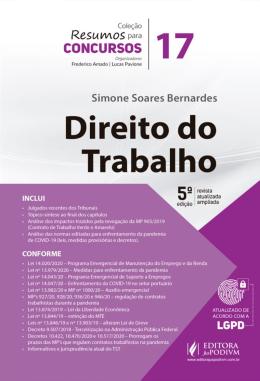 INCLUI: - Julgados recentes dos Tribunais - Tópico-síntese ao final dos capítulos - Análise dos impactos trazidos pela revogação da MP 905/2019 (Contrato de Trabalho Verde e Amarelo) - Análise das normas editadas para enfrentamento da pandemia de COVID-19 (leis, medidas provisórias e decretos). CONFORME: - Lei 14.020/2020 – Programa Emergencial de Manutenção do Emprego e da Renda - Lei nº 13.979/2020 – Medidas para enfrentamento da pandemia - Lei nº 14.043/20 – Programa Emergencial de Suporte a Empregos - Lei nº 14.047/20 – Enfrentamento da COVID-19 no setor portuário - Lei nº 13.982/20 e MP nº 1000/20 – Auxílio emergencial - MP’s 927/20, 928/20, 936/20 e 946/20 – regulação de contratos trabalhistas durante a pandemia - Lei 13.874/2019 – Lei da Liberdade Econômica - Lei nº 13.844/19 – extinção do MTE - Leis nº 13.846/19 e nº 13.903/19 – alteram Lei de Greve - Decreto 9.507/2018 - Terceirização na Administração Pública Federal - Decretos 10.422, 10.470/2020 e 10.517/2020 – Prorrogam os prazos das MP’s que regulam contratos trabalhistas na pandemia - Informativos e jurisprudência atual do TST CONHEÇA A COLEÇÃO: A Coleção Resumos para Concursos tem por objetivo a preparação do candidato em disciplinas jurídicas e não jurídicas de maneira objetiva e didática, com o uso de linguagem simples para facilitar a compreensão do leitor. Em todos os volumes foram abordados os temas essenciais de cada disciplina, sintetizados com bastante atenção para permitir ao leitor uma preparação efic