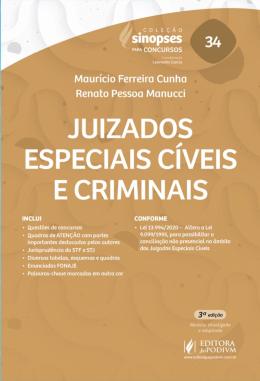 O LEITOR ENCONTRARÁ: - Questões de concursos - Quadros de ATENÇÃO com partes importantes destacadas pelos autores - Jurisprudência do STF e STJ - Diversas tabelas, esquemas e quadros - Enunciados FONAJE - Palavras-chave marcadas em outra cor CONFORME: - Lei 13.994/2020 – Altera a Lei 9.099/1995, para possibilitar a conciliação não presencial no âmbito dos Juizados Especiais Cíveis CONHEÇA A COLEÇÃO: A Coleção Sinopses para Concursos (clique aqui) tem por finalidade a preparação para concursos públicos de modo prático, sistematizado e objetivo. Foram separadas as principais matérias constantes nos editais e chamados professores especializados em preparação de concursos a fim de elaborarem, de forma didática, o material necessário para a aprovação em concursos. Diferentemente de outras sinopses/resumos, preocupamos em apresentar ao leitor o entendimento do STF e do STJ sobre os principais pontos, além de abordar temas tratados em manuais e livros mais densos. Assim, ao mesmo tempo em que o leitor encontrará um livro sistematizado e objetivo, também terá acesso a temas atuais e entendimentos jurisprudenciais. Dentro da metodologia que entendemos ser a mais apropriada para a preparação nas provas, demos destaques (em outra cor) às palavras-chaves, de modo a facilitar não somente a visualização, mas, sobretudo, à compreensão do que é mais importante dentro de cada matéria. Quadros sinóticos, tabelas comparativas, esquemas e gráficos são uma constante da coleção, aumentando a compr