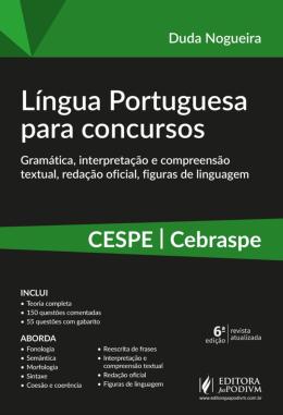 O LEITOR ENCONTRARÁ: Teoria completa 150 questões comentadas 55 questões com gabarito ABORDA: Fonologia Semântica Morfologia Sintaxe Coesão e coerência Reescrita de frases Interpretação e compreensão textual Redação oficial Figuras de linguagem POR QUE ESCOLHER O LIVRO LÍNGUA PORTUGUESA PARA CONCURSOS - CESPE / CEBRASPE? Esta obra foi concebida com o intuito de demonstrar como a banca CESPE | Cebraspe elabora as questões de Língua Portuguesa. É indicada a concursandos que precisam de teoria. Para direcionar o estudo, há 150 questões comentadas de 2021 e 55 questões com gabarito. É de suma importância exercitar e saber a aplicação da teoria. O livro é composto por oito partes: I. Fonologia; II. Morfologia; III. Sintaxe; IV. Tópico complementar (estudo dos vocábulos QUE, SE e COMO); V. Coesão e coerência – Reescritura de frases; VI. Interpretação de texto; VII. Redação oficial; VIII. Figuras de linguagem. Saiba: é possível aprender! A Autora