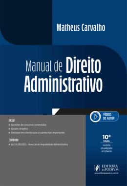 Inclui Vídeos com acesso via QR-code. Atualizado com a nova Lei de Improbidade Administrativa O LEITOR ENCONTRARÁ: - Questões de concursos comentadas - Quadro sinóptico - Súmulas e jurisprudência do STF e STJ organizadas ao final dos capítulos - Destaque em colorido para as partes mais importantes CONFORME: - Lei 14.230/2021 – Nova Lei de Improbidade Administrativa POR QUE ESCOLHER O LIVRO MANUAL DE DIREITO ADMINISTRATIVO? Neste Manual, tudo é tratado com extensão, tornando visível, no contexto de cada capítulo, a potencialidade da inteligência de quem dedicou todos os esforços para escrevê-lo. Os elementos de natureza política são apresentados ao lado dos seus efeitos jurídicos e, para propiciar um entendimento evolutivo da ciência jurídica aplicada ao Direito Administrativo, apresenta exemplos concretos e práticos, acompanhados da transcrição de textos legais, doutrinários e jurisprudenciais. Após cada capítulo, o Manual traz ainda questões cobradas em concursos para o ingresso em carreiras jurídicas e voltadas ao Direito Administrativo, como forma de permitir a assimilação e a revisão rápida e concisa dos conteúdos abordados. As temáticas foram cuidadosamente selecionadas de provas para diversos órgãos públicos e aplicadas por bancas já consagradas, como o Cespe/UnB, Fundação Carlos Chagas (FCC), Vunesp e a Esaf. Em razão da simplicidade da linguagem, a obra permite o rápido entendimento do Direito Administrativo, sua evolução, seus princípios e sua aplicação na Administra